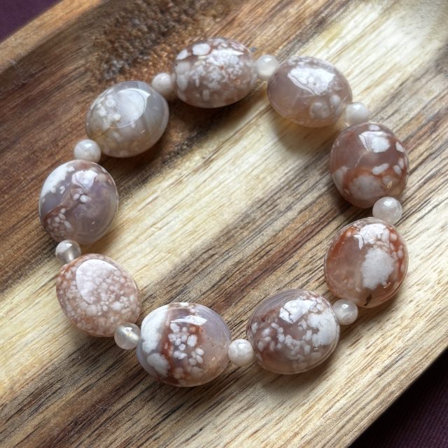 This Flower Agate bracelet showcases oval bean-shaped beads (24 x 16mm), each one featuring natural, delicate flower-like patterns. A rare and high-quality find — no two beads are alike.