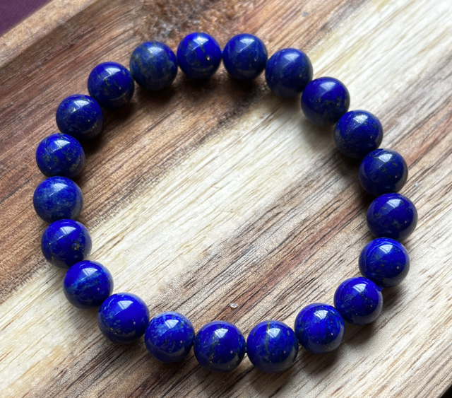 This Lapis Lazuli bracelet features polished 9mm beads in a deep, natural royal blue with shimmering golden pyrite inclusions. A powerful and refined crystal long associated with royalty, spiritual insight, and clear communication.