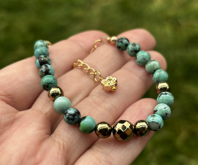 • The natural green turquoise beads (6mm) give it an earthy, grounding look with organic black matrix patterns.