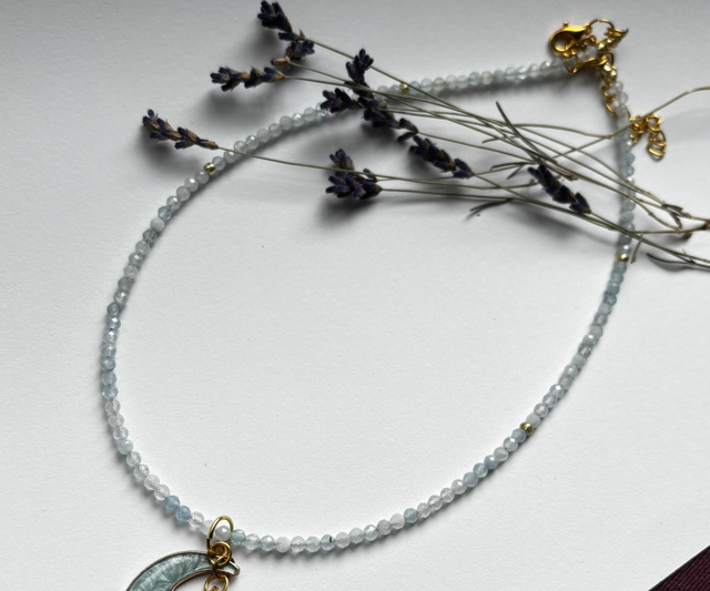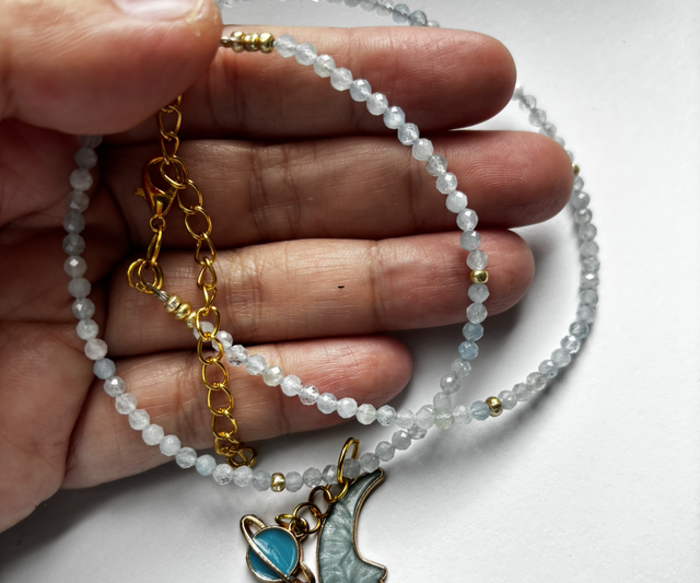 Made by Wind Series: Aquamarine with Moon & Saturn - Handmade Necklace