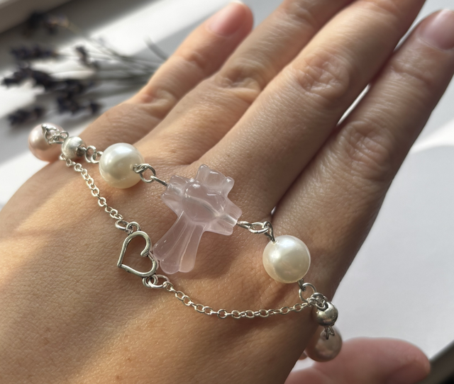 This one-of-a-kind bracelet is a gentle expression of love and emotional healing. At its centre, a beautifully carved rose quartz cross radiates softness and compassion, supported by delicate shell beads that echo the calming rhythm of the sea.