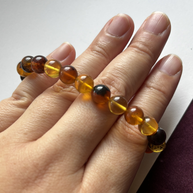 This genuine Baltic Amber in a stunning mix of honey, cognac, and deep cherry tones, this bracelet captures the beauty of nature’s ancient resin. Each polished 8mm bead radiates a warm glow and unique natural inclusions — no two pieces are ever the same.