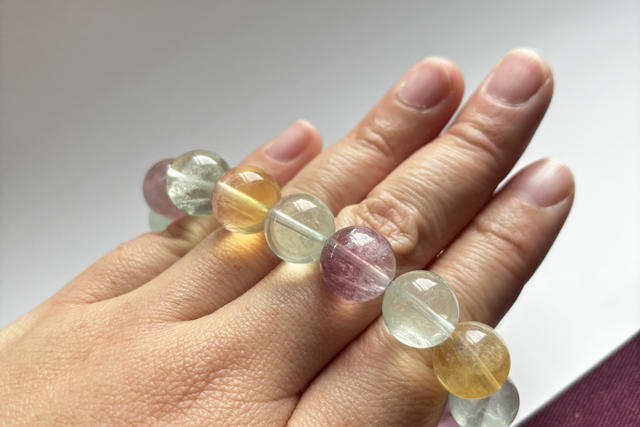 This stunning multi-colour fluorite bracelet features polished 13mm beads in a mix of purple, green, and clear tones. Each bead is unique, showcasing fluorite’s natural range of colours and soothing energy.